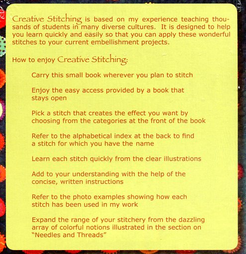 Details Sue's book 'Creative Stitching' includes step by step concise written instructions, along with clear illustrations, for 50 of Sue's favorite stitches. Included are close up, color, photographic examples of each of the stitches used. The beginning of 'Creative Stitching' gives you a detailed look into the needles and threads Sue uses, and throughout the book are never before seen color photographs of Sue's work. 'Creative Stitching' is spiral bound to stay open to the page you are using, is small in size to conveniently take with you anywhere, has an alphabetical index in the back of the book along with a category breakdown of stitches in the front which allows you to choose a stitch by the effect you are looking for. 'Creative Stitching' is the must have book for you to begin creating highly embellished, textural pieces of art.Contents Outline Stitches Textural Filler Stitches Linear Filler and Outline Stitches Beading StitchesSecond Edition includes the same great features as the first, plus: - Over 20 new stitches