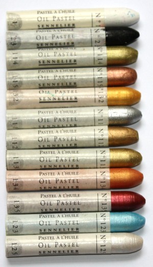 The Sennelier oil pastels possess an extraordinarily high pigment content, thus providing them with a high colouring and covering potential and excellent brightness. Colours below, in order are: White, Black, Rich Gold, Red Copper, Golden Pearl, Aluminium, Pale Gold, Rich Pale Gold, Red Gold, Reddish Bronze Gold, Transparent Blue, Iridescent White.