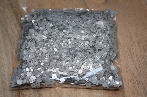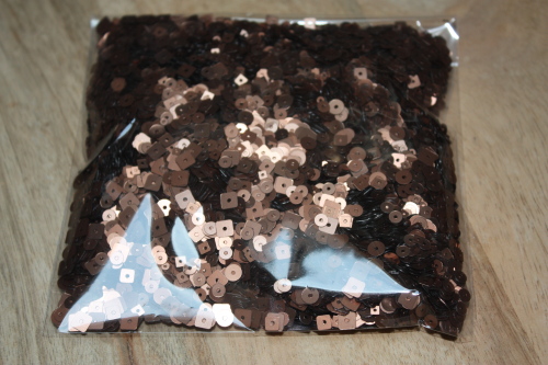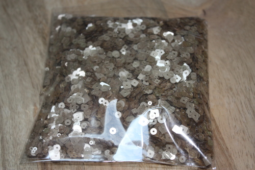 | Tiny Metallic Coloured Sequins $5.00 ($4.55) / pack of approx. 100g Please note - we now sell these sequins as a mix of all sizes and shapes, grouped by colour. We have four sizes of sequins; 2mm, 3mm, 4mm, and 5mm diameter, and in two styles; round and square, combined with four colour options; gold, silver, copper and brass. A total of 32 different sequin types. Brass is shown below. The gold is a light champange shade. |