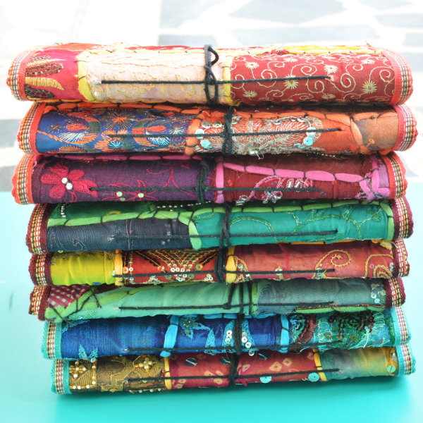 | Patchwork Fabric Diary $16.00 ($14.55) / diary $66.00 ($60.00) / set of five diaries These are delightful colourful diaries and will make wonderful gifts or to keep for yourself. Each handmade paper diary has a handcrafted patchwork fabric cover. The closure is a string wrap pattern. These are Bahi stitched diarys containing 50 pages (100 sides) of handmade paper, approximately 11cm x 17cm. Available in a myriad of colours; simply indicate your preference. All covers are different. For gift givers, we do a special bulk price! ($66.00 for five) |