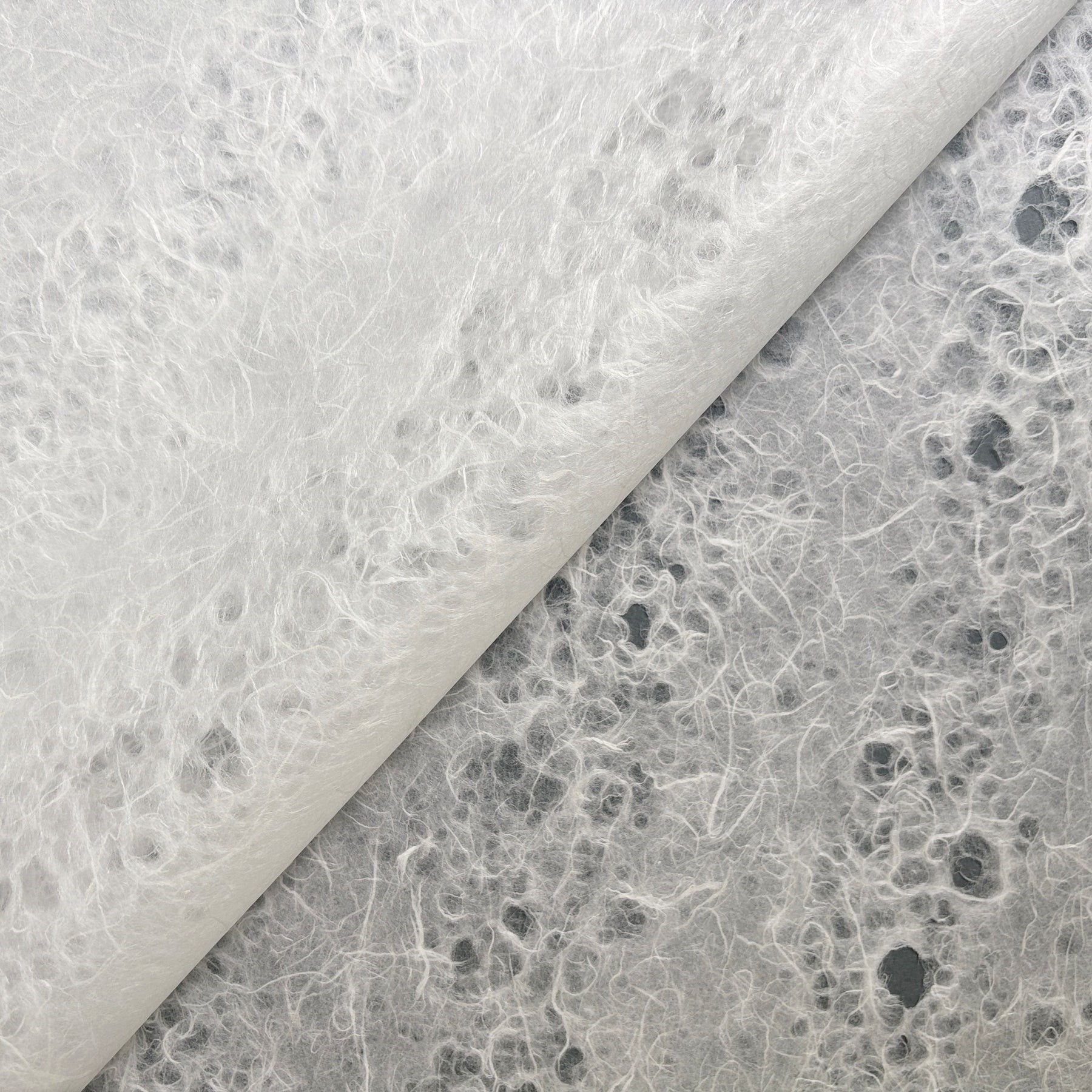 Designed with a striking two-tone blend of chiri (mulberry bark) and white fibers, each sheet showcases an organic texture and natural variation. The rough surface enhances tactile appeal, making it an ideal choice for paper artists and designers seeking authentic, earthy aesthetics.