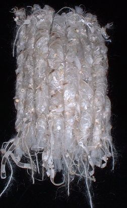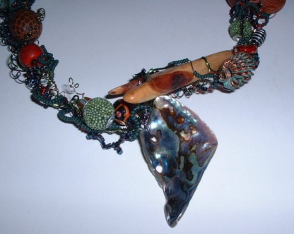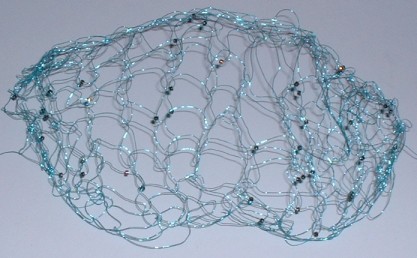 Gauges 111, 1V & V are super for using with our wire coiler, and for all sorts of wrapping and twisting. |  Coiler in action - - - (no longer available) |  Pendant section of a necklace, which incorporates twisted wire. |  Gauge 1 and 11 are both suitable for knitting and crotcheting. Think about incorporating these pieces in your embroidery (machine or hand), working on water soluble fabrics, for example. |  Or thread them with beads and use for wrappings or machine embroidery to make beads and cords which you can manipulate. |  'Wedding Bag' Silk paper wrapped with wire and beads. |