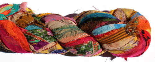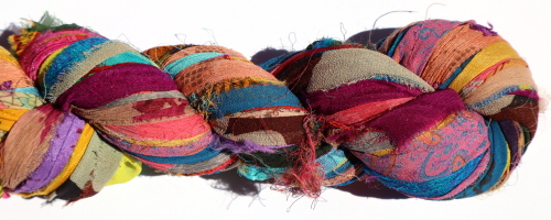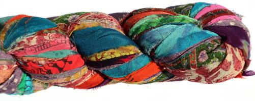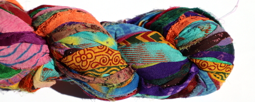 Silk chiffon sari fabric from India. 100 g hanks, approximately 50 metres, of ribbon, 10mm - 20mm wide, hand cut and then sewn together in long strips.