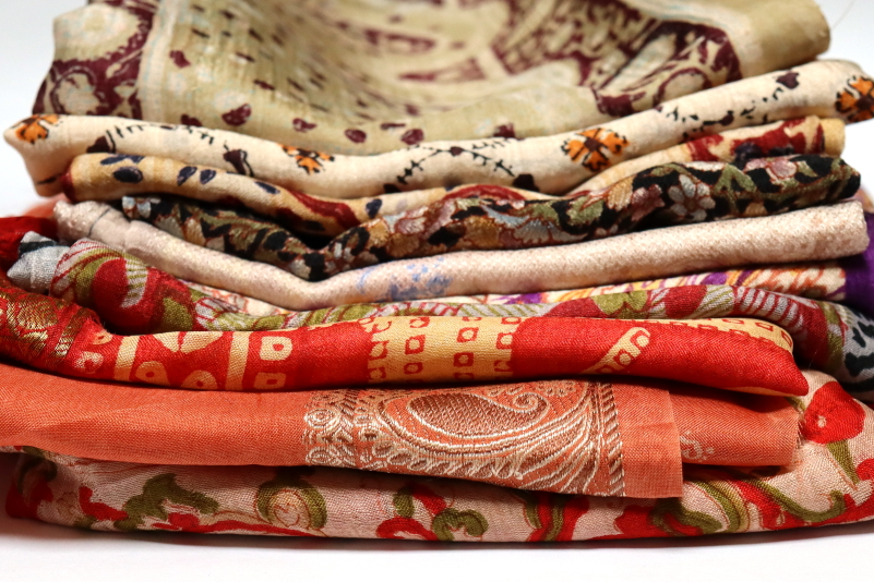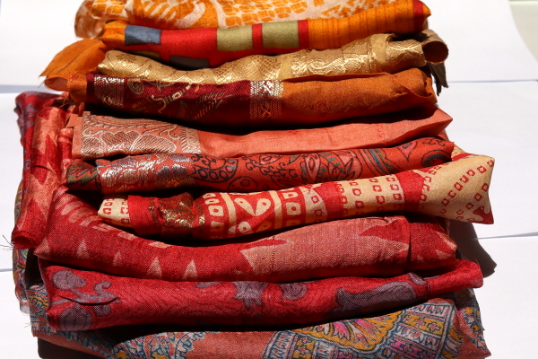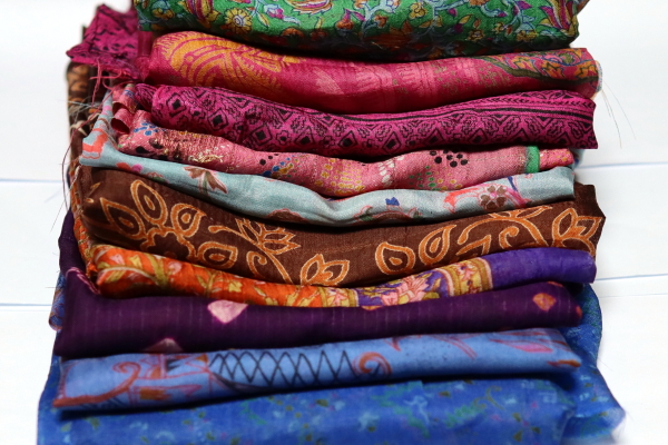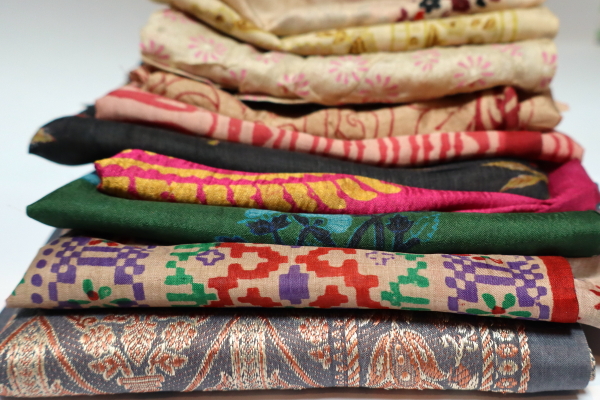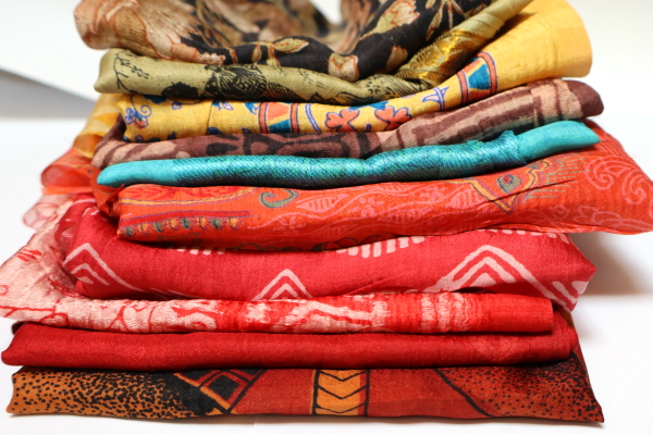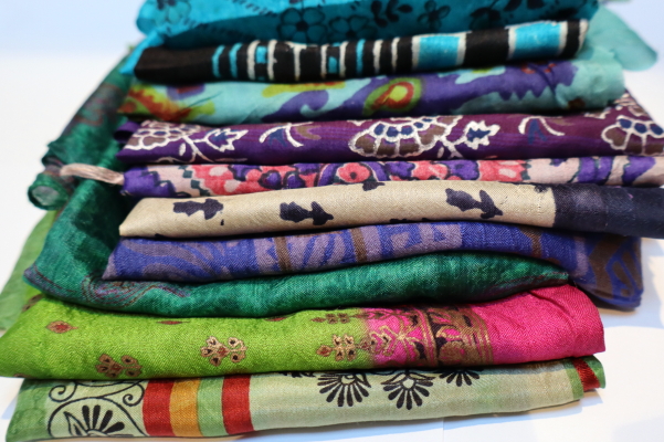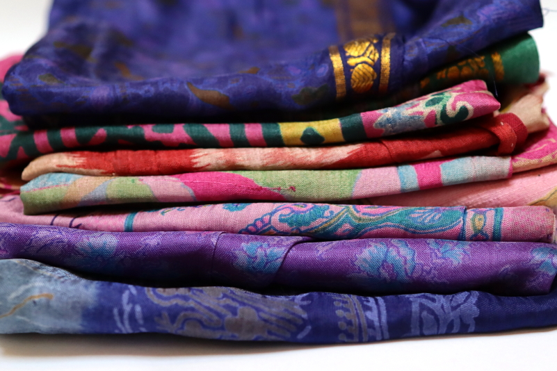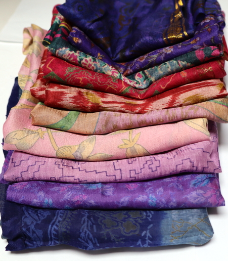 Pre-loved fabric from old saris. Sari silk can be shredded and turned into silk saree ribbon or spun into yarn. Can also be used for rag rugs, weaving rugs, jewellry, upcycled clothes, quilting and embroidery. Fabulous for nuno-felting.