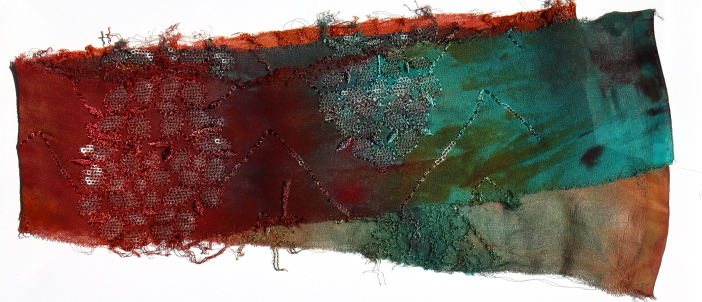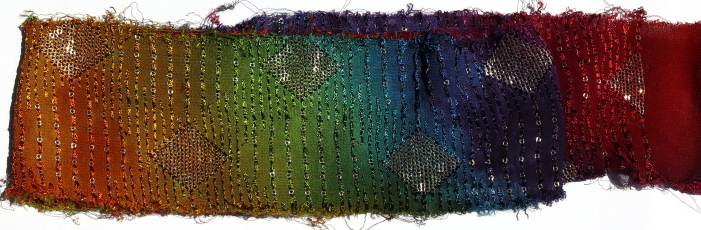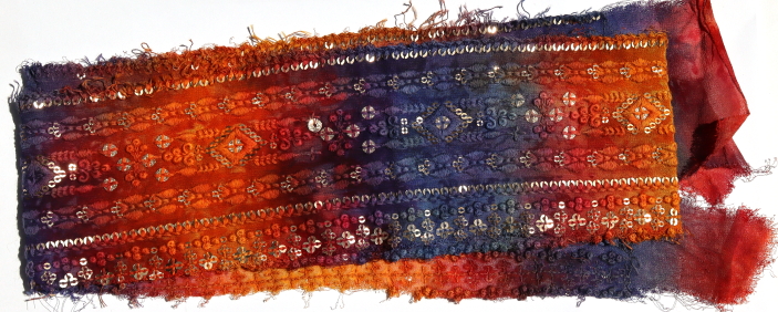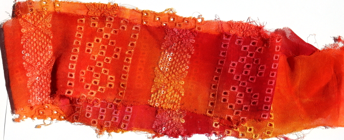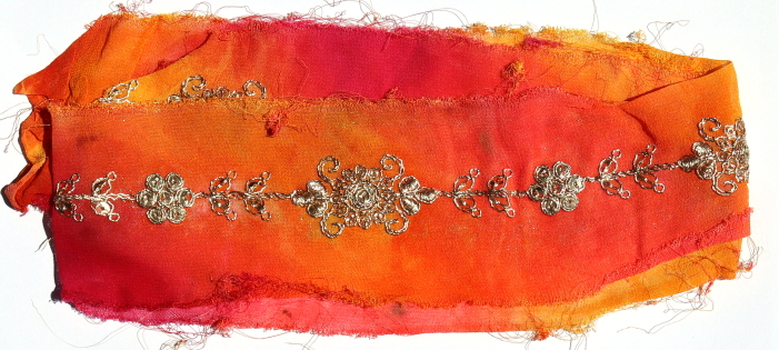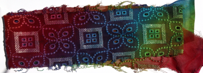 Approximately 6 - 10 cm wide. Each piece approximately 1 metre in length. All manner of different emboidered surfaces, each unique. Many uses in your textile in your textile work.