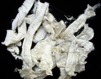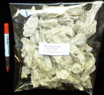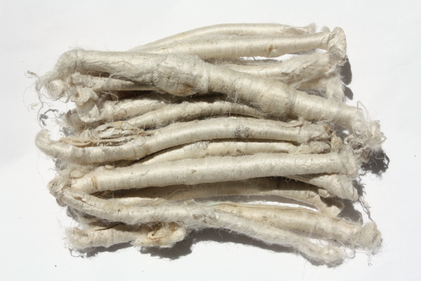 Silk carrier rods are formed over a rod in the silk reeling process. The silk waste builds up and is sliced away and discarded. This silk waste can be purchased in its natural form, creamy white and full of sericen, or washed and dyed.
