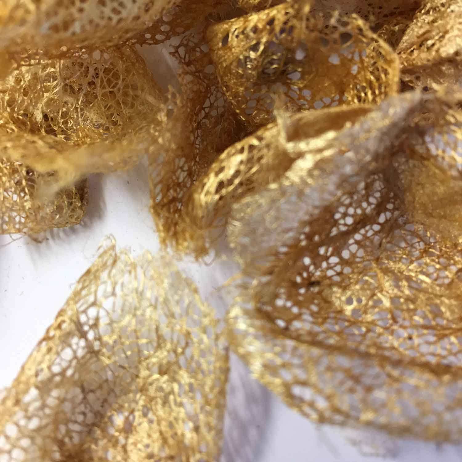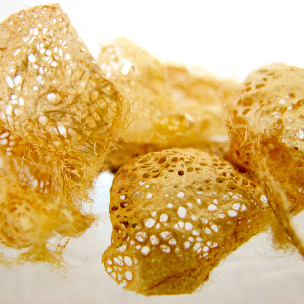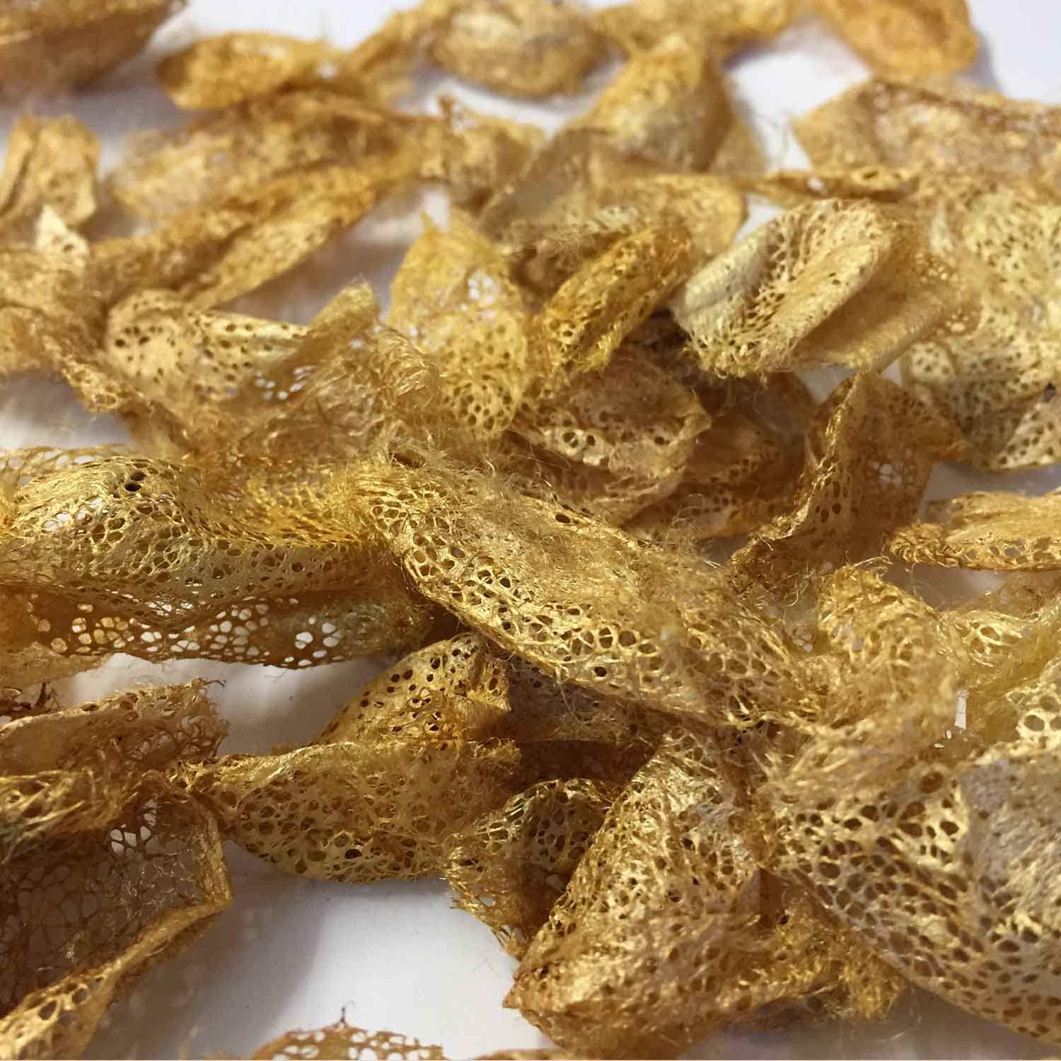 Cricula Cocoons are so interesting and unique. They are the lacey caps that the wild silk worm spins and attaches to a tree branch. The golden yellow cocoons are covered in small, uneven holes which create the beautiful, lacey effect.They are at their most beautiful used in their natural form as embellishments and surface decoration or trims, or for incorporating into felting or weavings. Unlike other silk cocoons, they cannot be drawn out or spun very easily, due to the distinctive intricate lacy network.