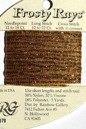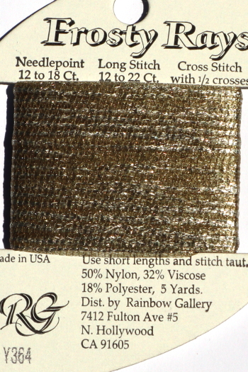 Rainbow Gallery Frosty Rays is a tubular thread with a metallic thread running through the tube. It is Nylon/Viscose/Polyester and has 4.6 metres on the card. It is great for cross stitch, canvas work, Stumpwork and Goldwork.