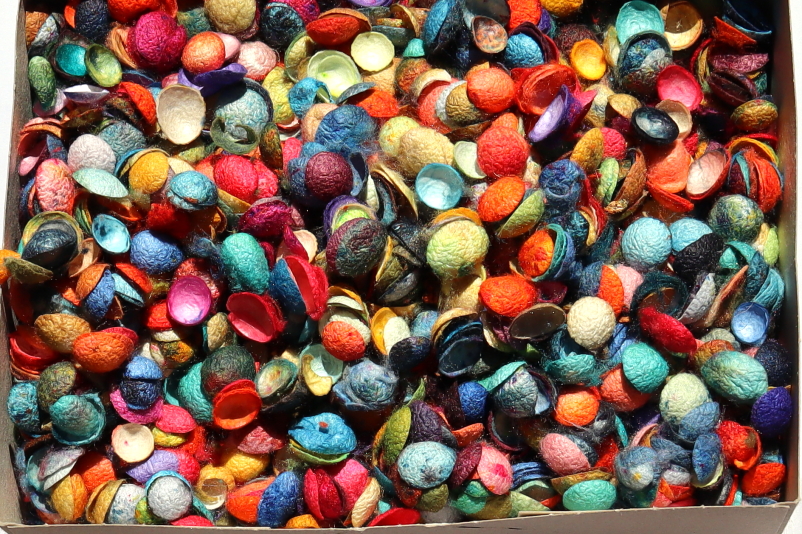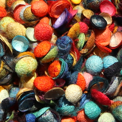 Silk Jewels are the caps cut off from silk cocoons during production. They are real gems, as they are picked up by hand from the floor of the production facility during production. The same procedure awaits us after the jewels come out of the washing machine. Then all the jewels have gotten tangled up in the threads loosened by the washing and have to be plucked out individually… like North Sea garnet, just not as tasty.