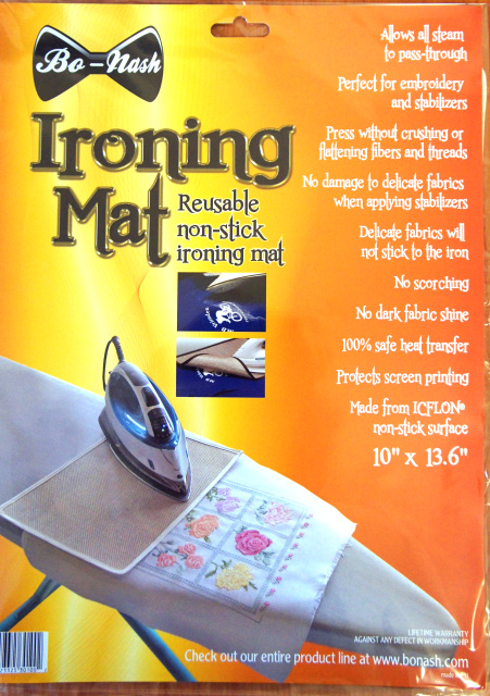 | Reusable, Non-Stick Bo-Nash Ironing Mat. The Bo-Nash Ironing Mat is perfect for ironing over delicate fabrics, prints, or doing crafty things that require an iron but get stuck on its bottom and ruins it! • Allows all the steam to pass through the holes • No more scorch patches • Works as a pressing cloth, no more shine left behind • Protects all prints and delicate fabrics • 100% safe heat transfer • The size of the Mat is 25.4 cm x 34.3cm (10" x 13.5") |