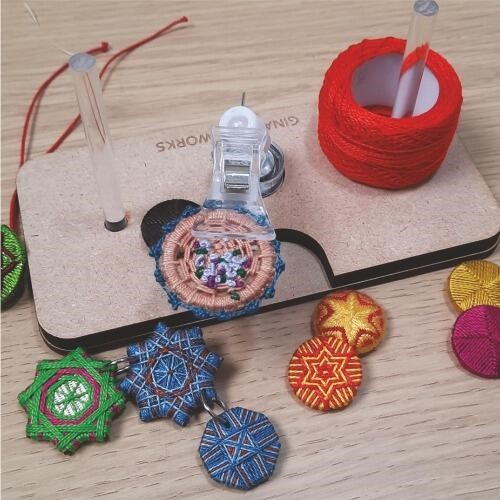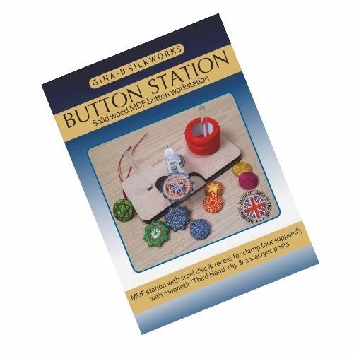 The Third Hand has a magnetic base. The station includes a steel disc for the clip to attach to. It is great for holding wrapped buttons while you thread a needle or even holding ring buttons while you work French knots - perfect for those Dorset button trees. (The magnet will also hold your needles, of course)
