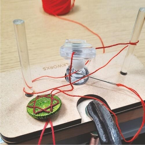 The Third Hand is inspired by a foot-operated button-holding tool traditionally used in Austria when decorating ring buttons. This clip will come in handy for a variety of button-making tasks—even if only holding the button you are working on while you thread your needle.