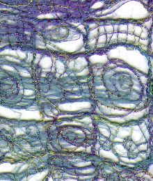 • Without a hoop to simply stitch on or lay fibres (eg silk or wool) on top and stitch or lay metal pieces/fabric scraps/ribbon/wool etc and stitch.